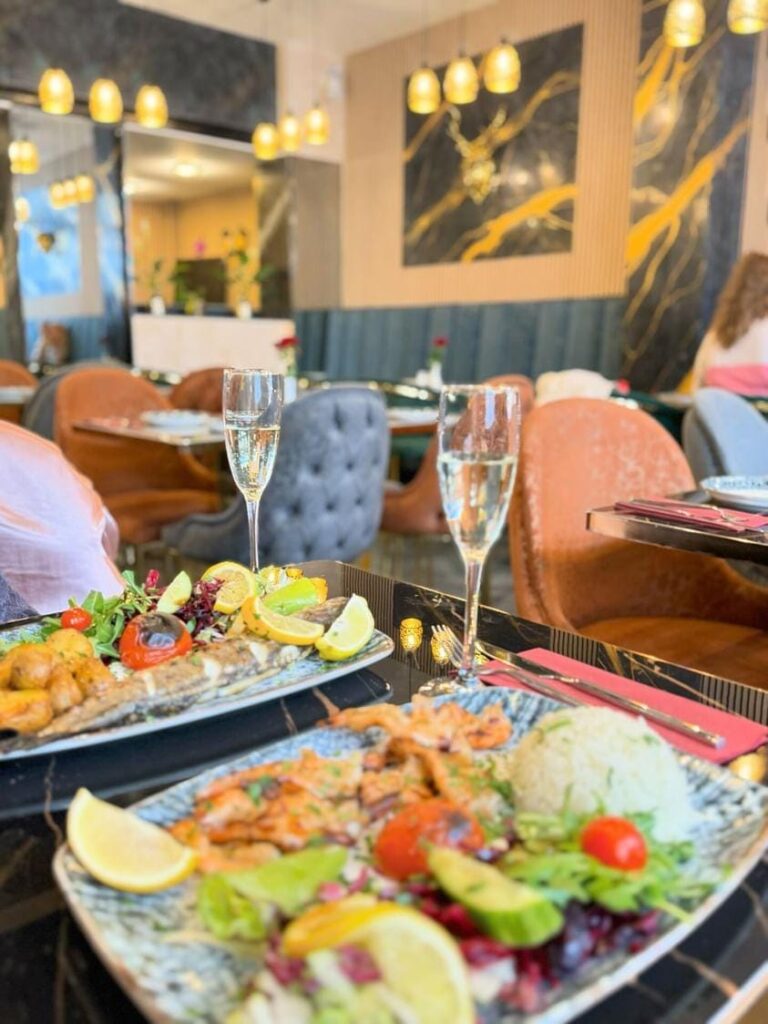 Marinated whole sea bass, chargrilled and served with potatoes and mixed vegetables